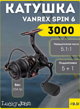 Lucky John Vanrex Spin 6 3000FD — это высококачественная безынерционная катушка, принадлежащая классу трёхтысячников. Она поставляется сразу с двумя шпулями разного типа: металлическая и графитовая, что позволяет выбирать оптимальный вариант в зависимости от ситуации. Внутри устройства установлено пять шарикоподшипников и один роликового типа, гарантирующих бесперебойную работу и долгий срок службы изделия.